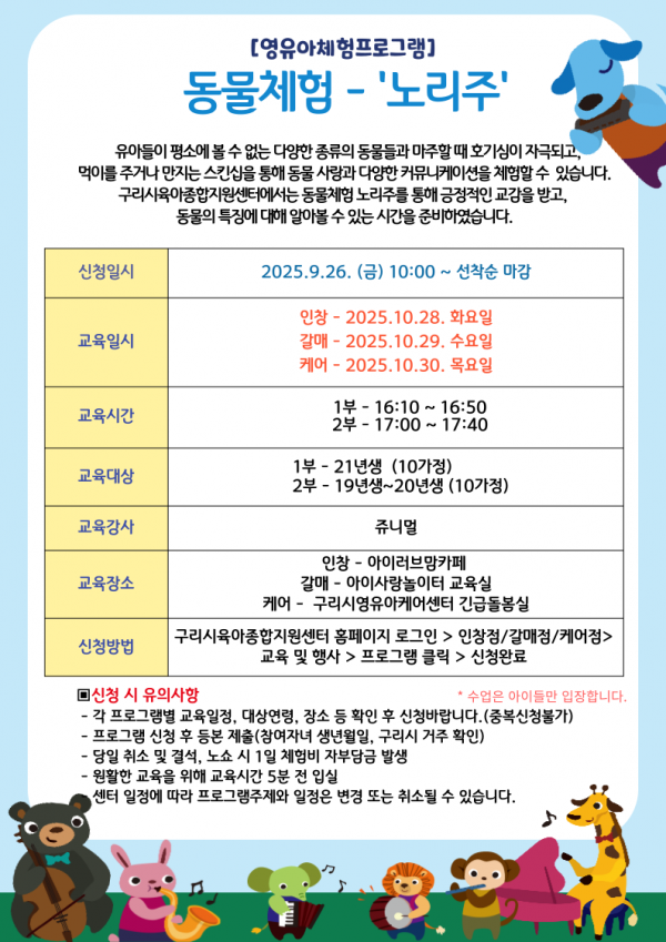 | 교육대상 | 구리시 관내5세 유아 | 교육정원 | 9명 (대기자 10명) |