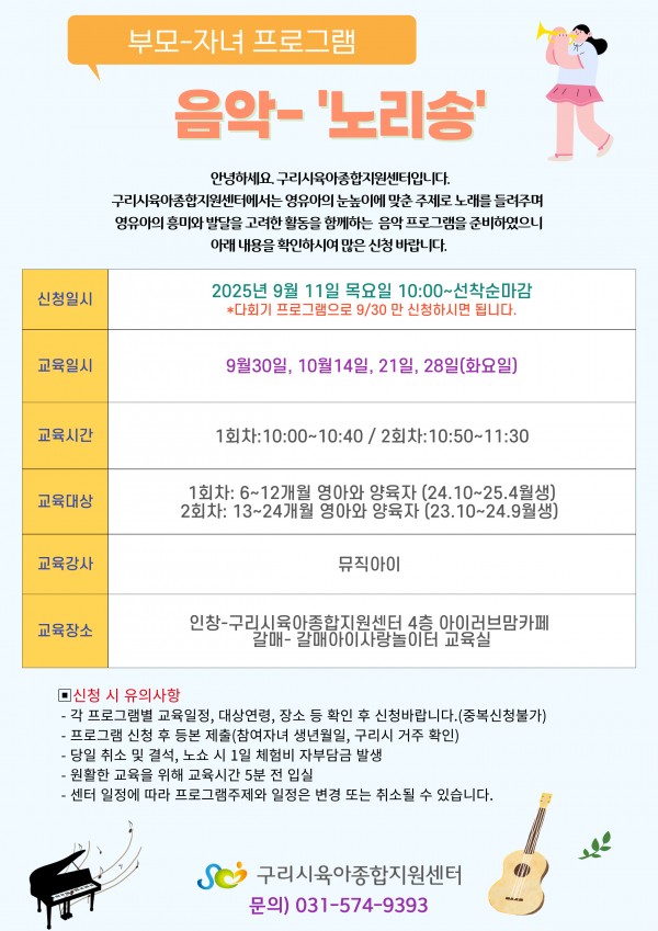 | 교육대상 | 구리시 관내 6~12개월 영아와 양육자 | 교육정원 | 10명 (대기자 10명) |