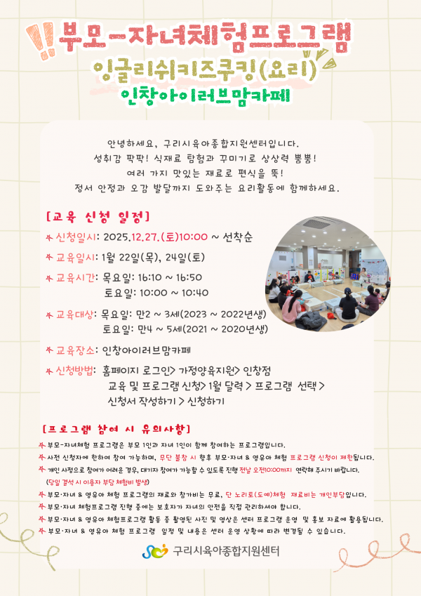 | 교육대상 | 구리시 관내 유아가정 | 교육정원 | 8명 (대기자 20명) |