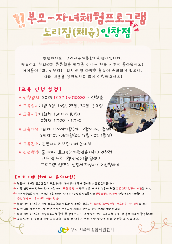 | 교육대상 | 구리시 관내 영아가정 | 교육정원 | 8명 (대기자 8명) |