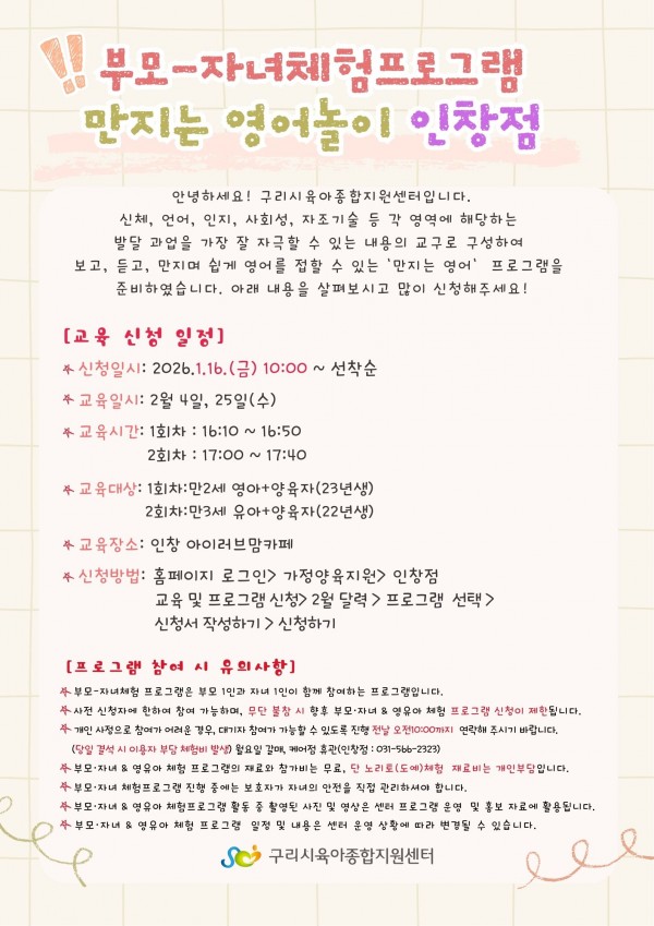 | 교육대상 | 구리시 관내 22년생 유아가정 | 교육정원 | 10명 (대기자 10명) |
