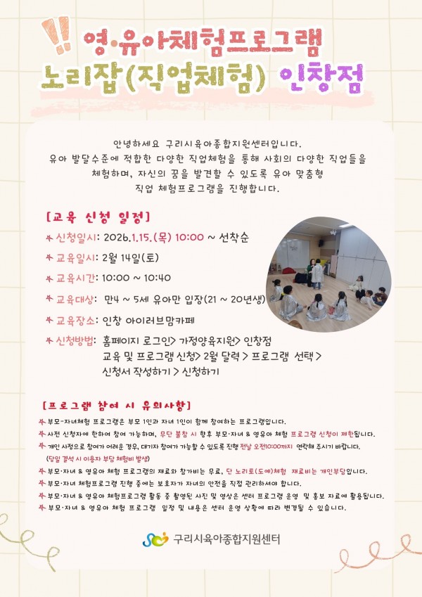 | 교육대상 | 구리시 관내 20~21년생 유아 | 교육정원 | 10명 (대기자 10명) |