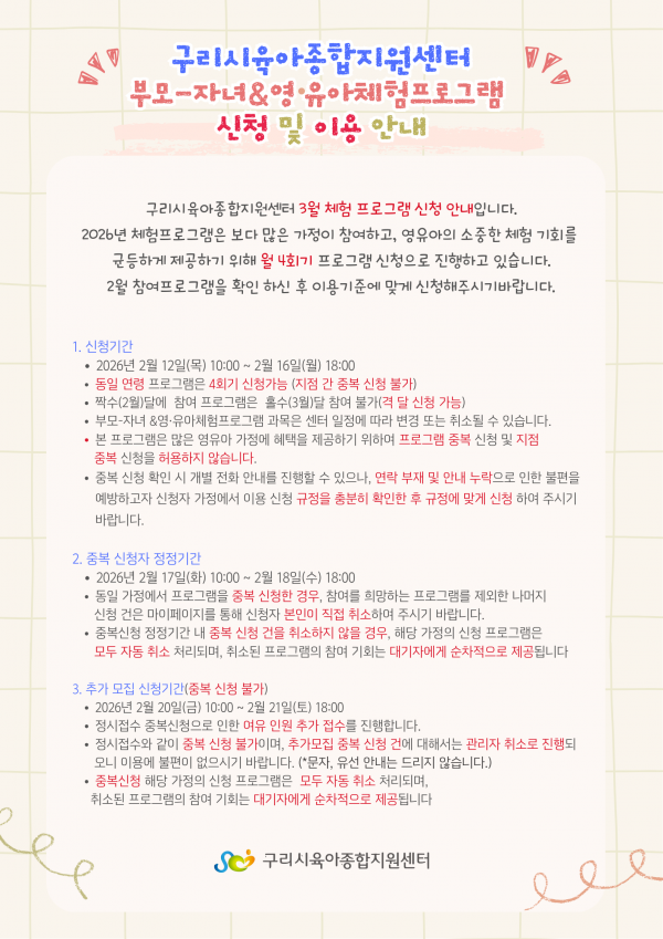 | 교육대상 | 구리시 관내 20~21년생 유아가정 | 교육정원 | 6명 (대기자 0명) |