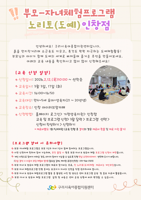 | 교육대상 | 구리시 관내 6~7세 유아가정 | 교육정원 | 5명 (대기자 10명) |