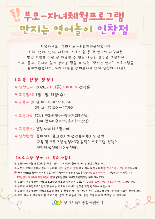 | 교육대상 | 구리시 관내 23년생 영아가정 | 교육정원 | 8명 (대기자 10명) |
