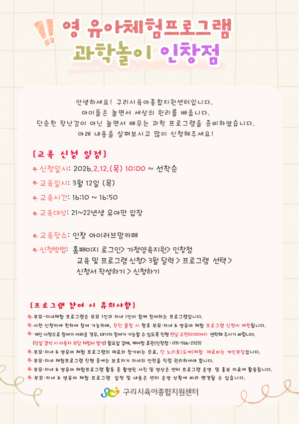 | 교육대상 | 구리시 관내 21~22년 유아만 입장 | 교육정원 | 0명 (대기자 5명) |