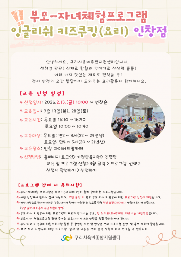 | 교육대상 | 구리시 관내 20~21년생 유아가정 | 교육정원 | 1명 (대기자 5명) |