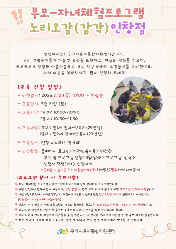 | 교육대상 | 구리시 관내 23년생 영아가정 | 교육정원 | 1명 (대기자 5명) |