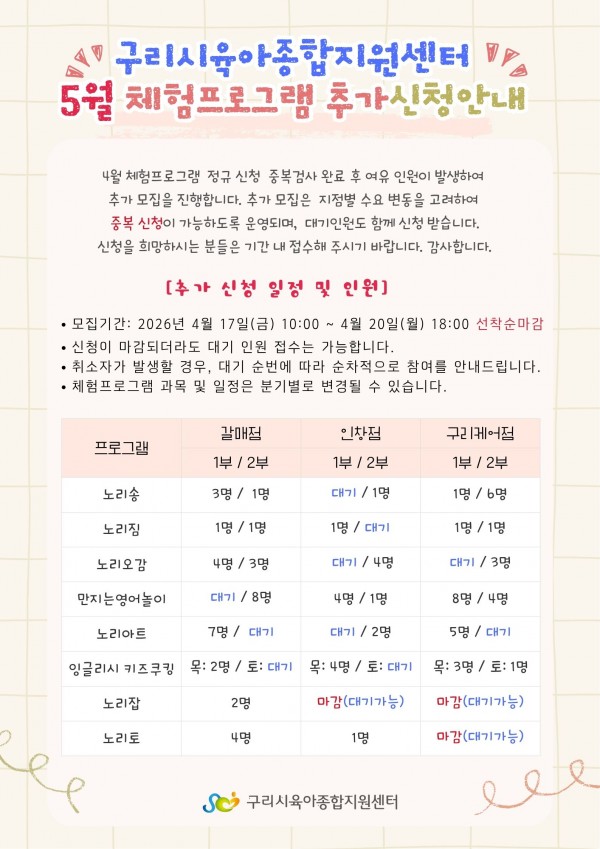 | 교육대상 | 구리시 관내13~24개월 영아가정 | 교육정원 | 1명 (대기자 10명) |