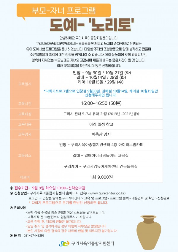 교육대상 | 구리시 관내 5~7세 유아와 양육자 | 교육정원 | 10명 (대기자 10명) |