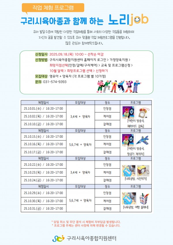 | 교육대상 | 구리시 관내 3~4세 영아와 양육자 | 교육정원 | 10명 (대기자 10명) |