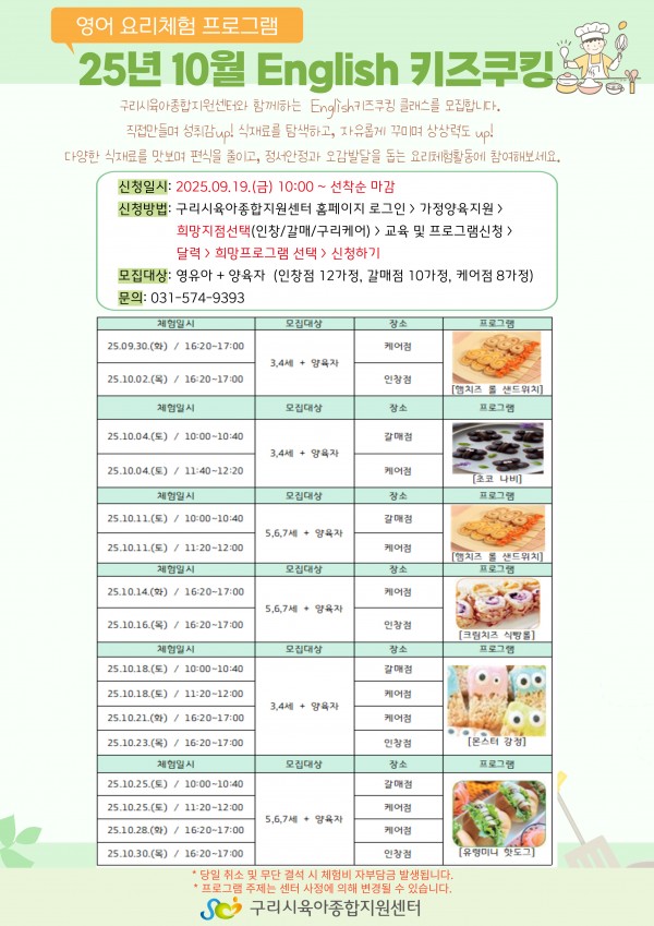 | 교육대상 | 구리시 관내 5~7세 영아와 양육자 | 교육정원 | 10명 (대기자 10명) |