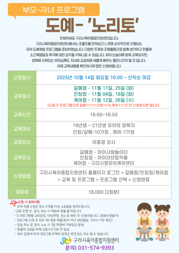 | 교육대상 | 구리시 관내 5~7세 유아와 양육자 | 교육정원 | 10명 (대기자 10명) |