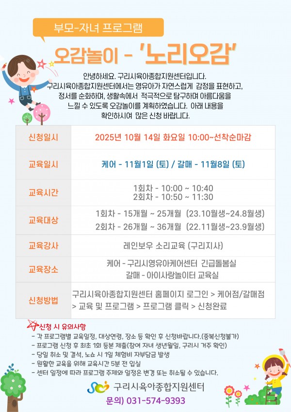 | 교육대상 | 구리시 관내 26개월~36개월 영아와 양육자 | 교육정원 | 7명 (대기자 10명) |
