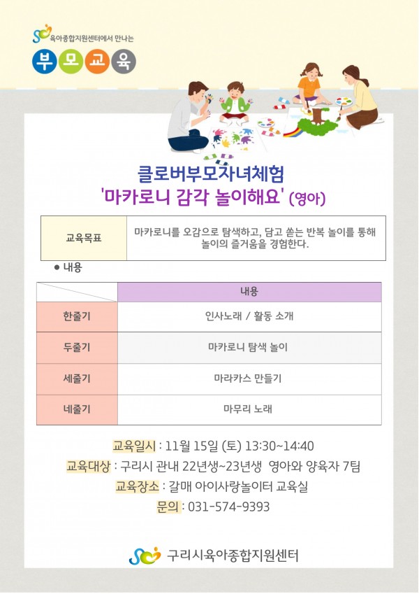 | 교육대상 | 구리시 관내 영아 가정 | 교육정원 | 7명 (대기자 10명) |