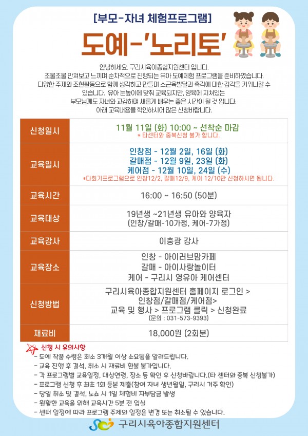 | 교육대상 | 구리시 관내 5~7세 유아와 양육자 | 교육정원 | 10명 (대기자 10명) |