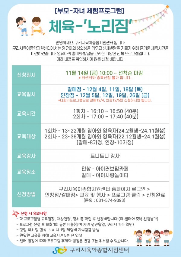 | 교육대상 | 구리시 관내 13~22개월 영아와 양육자 | 교육정원 | 6명 (대기자 10명) |