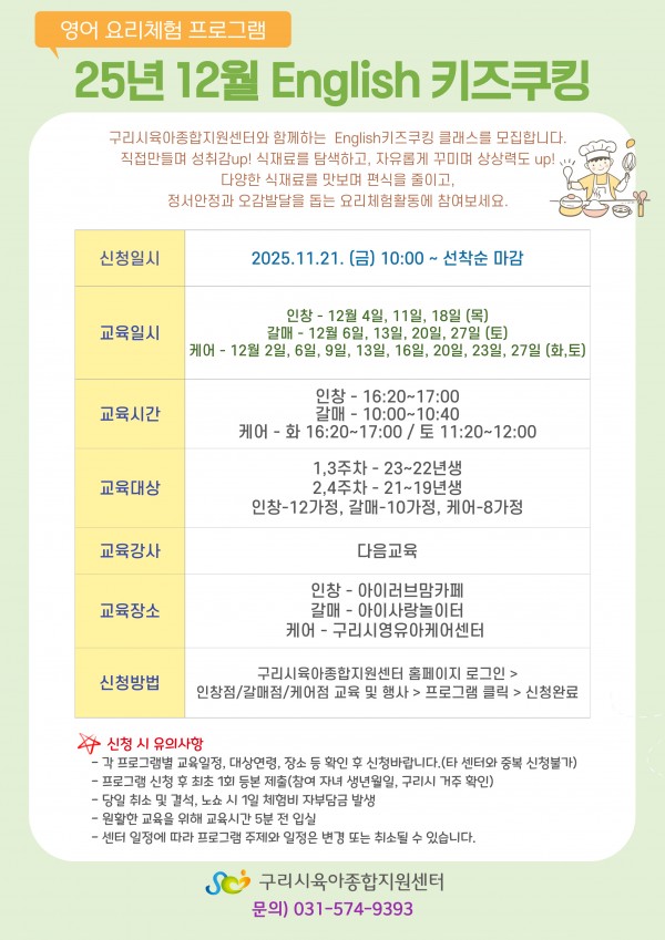 | 교육대상 | 구리시 관내 5~7세 유아와 양육자 | 교육정원 | 10명 (대기자 10명) |