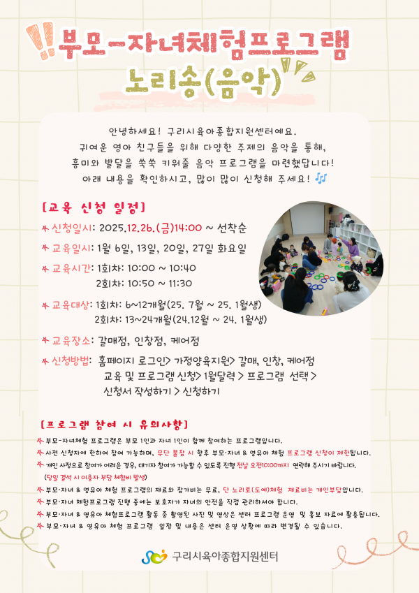 | 교육대상 | 구리시 관내 영아 13~24개월 영아와 양육자 | 교육정원 | 8명 (대기자 20명) |