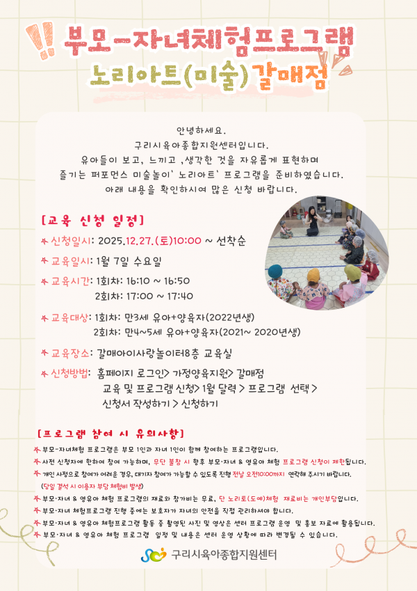 | 교육대상 | 구리시 관내 20년생~21년생 유아+양육자 | 교육정원 | 7명 (대기자 15명) |