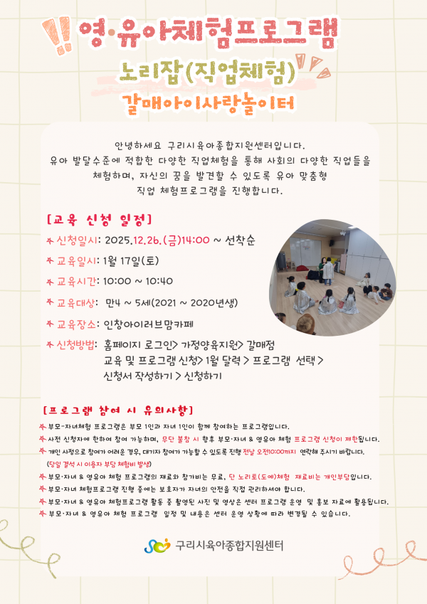 | 교육대상 | 구리시 관내 21~20년생 유아 | 교육정원 | 10명 (대기자 15명) |