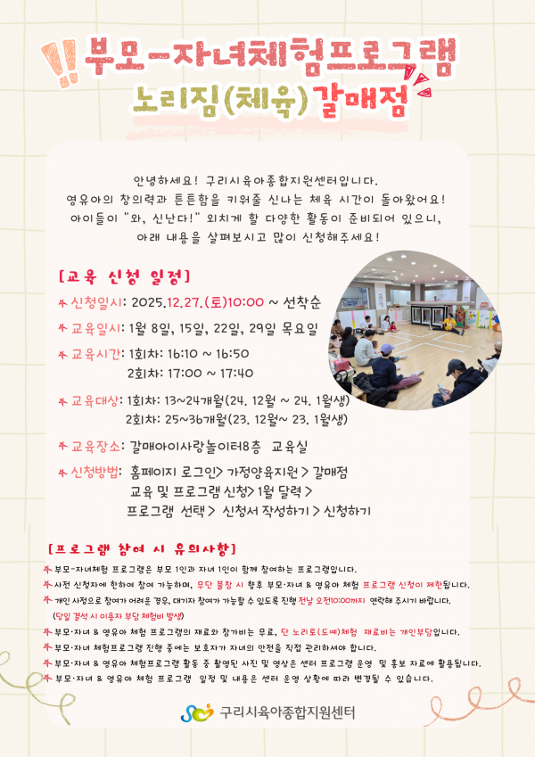 | 교육대상 | 구리시 관내 13~24개월 영아와 양육자 | 교육정원 | 6명 (대기자 15명) |