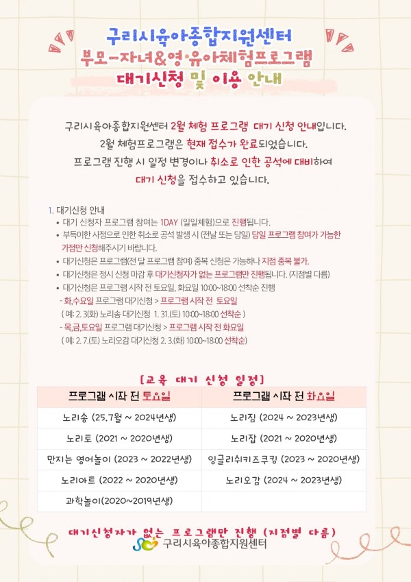 | 교육대상 | 구리시 관내 영아 13~24개월 영아와 양육자 | 교육정원 | 4명 (대기자 5명) |