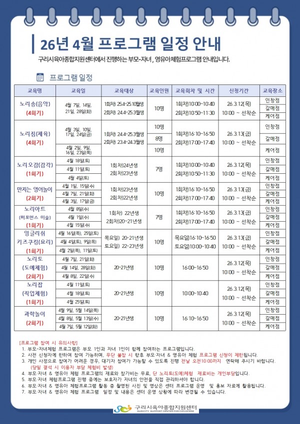 | 교육대상 | 구리시 관내 25~36개월 영아와 양육자 | 교육정원 | 8명 (대기자 0명) |