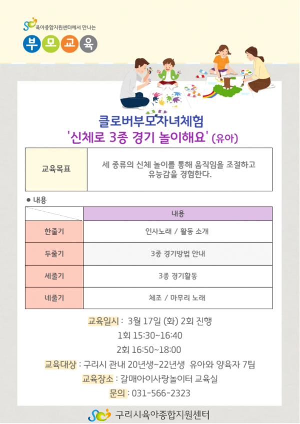 | 교육대상 | 구리시 관내 유아 가정 | 교육정원 | 7명 (대기자 10명) |