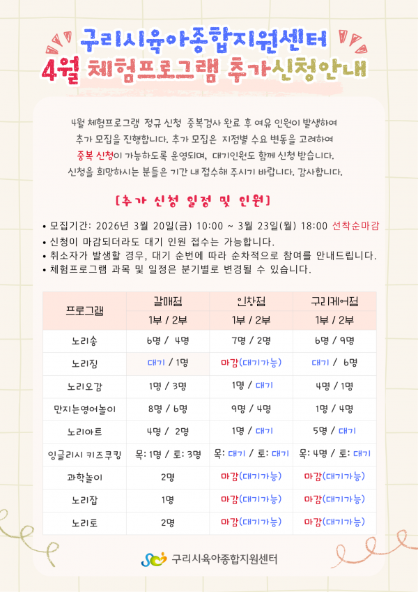 | 교육대상 | 구리시 관내 24년생 영아와 양육자 | 교육정원 | 1명 (대기자 10명) |