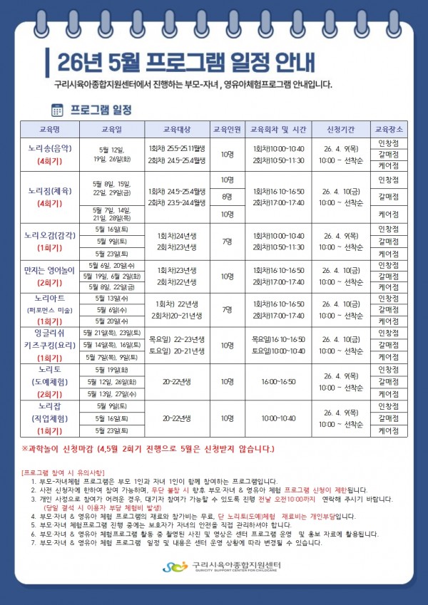 | 교육대상 | 구리시 관내 20~22년생 유아만 입장 | 교육정원 | 10명 (대기자 0명) |