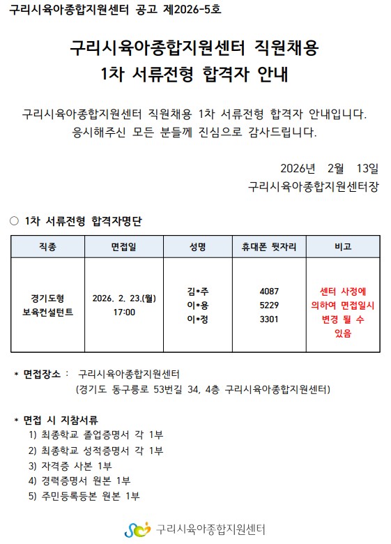 공지 (공고 제2026-5호) 구리시육아종합지원센터 직원 채용 1차 서류전형 합격자 안내 페이지 정보 작성자 관리자 댓글 0건 조회 12회 작성일 2026-02-13 14:57 본문 . 목록 다음글[교육부] 2026년 보육사업안내(지침) 26.02.06