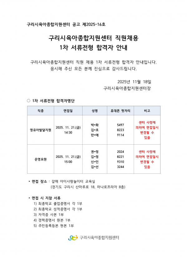 센터 (공고 제2025-16호) 구리시육아종합지원센터 직원 채용 1차 서류전형 합격자 안내 페이지 정보 작성자 관리자 댓글 0건 조회 51회 작성일 2025-11-18 16:41 본문 목록 다음글2025 '세계를 품은 어린이집' 정서지원교육 프로그램 적용 우수사례 공모전 심사 발표 25.11.17