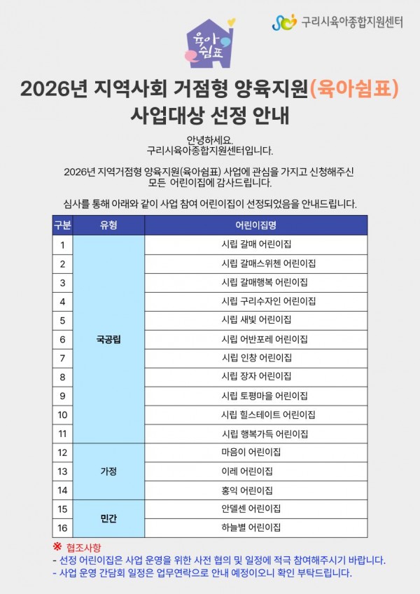 공지 2026년 지역사회 거점형 어린이집(육아쉼표) 선정 결과 안내 페이지 정보 작성자 관리자 댓글 0건 조회 14회 작성일 2026-04-14 18:11 본문 . 목록 다음글플라스틱 중고 장난감 나눔 캠페인 참여 안내(어린이집) 26.04.06