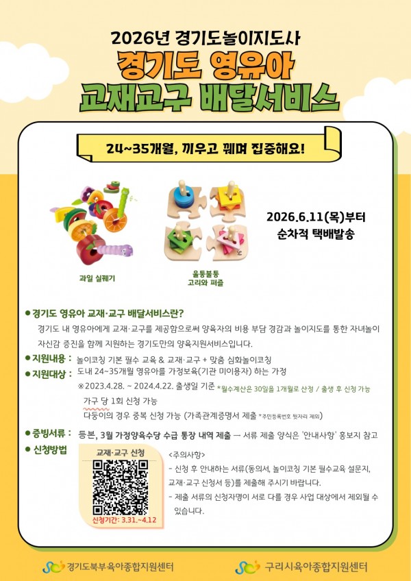 가정양육지원 [경기도 놀이지도사] 2026 경기도 교재교구 배달 서비스 안내 및 Q&A 페이지 정보 작성자 관리자 댓글 0건 조회 322회 작성일 2026-03-14 18:09 본문 목록 이전글[부모자녀프로그램]구리시영유아케어센터-노리송 26.03.17 다음글[부모자녀체험프로그램]갈매아이사랑놀이터-노리오감 26.03.14