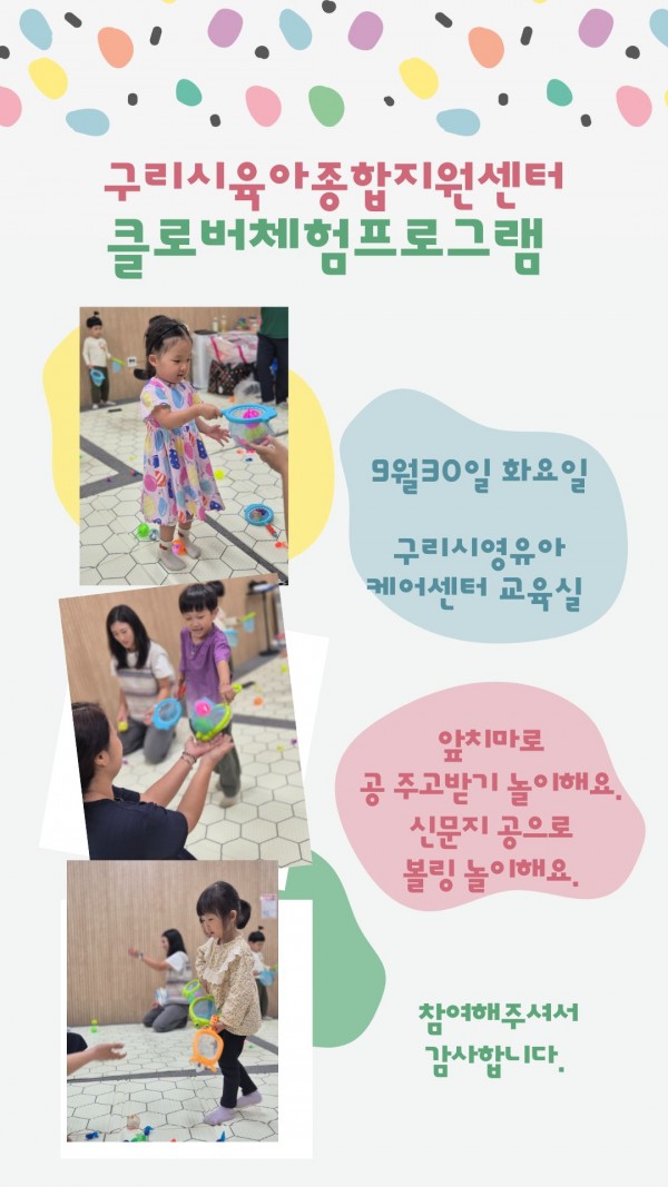 가정양육지원 [클로버체험프로그램] 페이지 정보 작성자 관리자 댓글 0건 조회 21회 작성일 2025-10-01 10:35 본문 참여해주셔서 감사합니다~ 목록 이전글[우리아이 첫 음악회] 25.10.01 다음글[부모자녀프로그램]갈매아이사랑놀이터-노리송 25.09.30