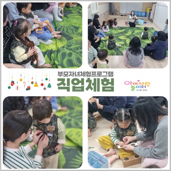 가정양육지원 [부모자녀프로그램]갈매아이사랑놀이터-직업체험 페이지 정보 작성자 관리자 댓글 0건 조회 143회 작성일 2025-12-20 15:57 본문 야생동물 구조대&스피커 개발연구원 직업에 대해 체험해 보았어요 ♥ 목록 이전글[부모자녀프로그램]갈매아이사랑놀이터-잉글리쉬키즈쿠킹 25.12.20 다음글[부모자녀프로그램]구리시영유아케어센터-잉글리시키즈쿠킹 25.12.20