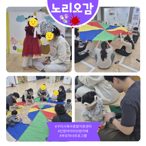가정양육지원 [부모자녀프로그램]인창아이러브맘카페-노리오감 페이지 정보 작성자 관리자 댓글 0건 조회 7회 작성일 2026-02-21 13:50 본문 오늘은 '편백나무큐브'를 사용하여 다양한 오감놀이를 했습니다.참여해 주셔서 감사합니다 ^^ 목록 이전글[부모자녀프로그램]구리시영유아케어센터-노리짐 26.02.21 다음글[부모자녀프로그램]인창아이러브맘카페-노리짐 26.02.21