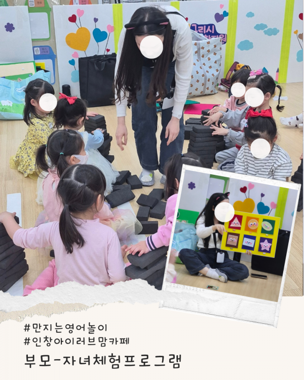 가정양육지원 [부모자녀프로그램]인창아이러브맘카페-만지는영어놀이 페이지 정보 작성자 관리자 댓글 0건 조회 5회 작성일 2026-04-03 13:53 본문 오늘은 '굴러가요! 표정도 보여요!'를 주제로 즐겁게 활동했습니다.참여해 주셔서 감사합니다 ^^ 목록 이전글[부모-자녀체험프로그램] 구리시영유아케어센터 -만지는영어놀이 26.04.03 다음글[부모-자녀체험프로그램]구리시영유아케어센터-노리짐 26.04.02