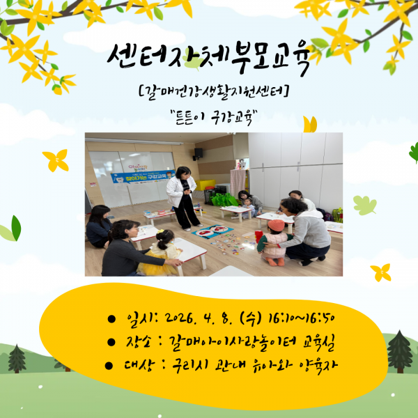 가정양육지원 [센터자체부모교육] 갈매건강생활지원센터 '튼튼이 구강교육' 페이지 정보 작성자 관리자 댓글 0건 조회 12회 작성일 2026-04-10 20:05 본문 참여해주셔서 감사합니다. 목록 다음글[공통부모교육] 영유아기질이해 26.04.10