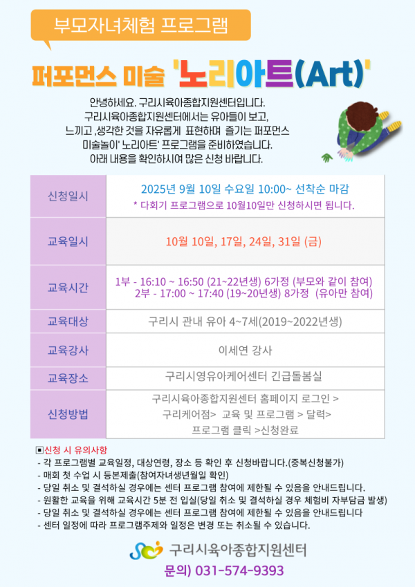 | 교육대상 | 구리시 관내 4~5세 유아가정 | 교육정원 | 6명 (대기자 6명) |