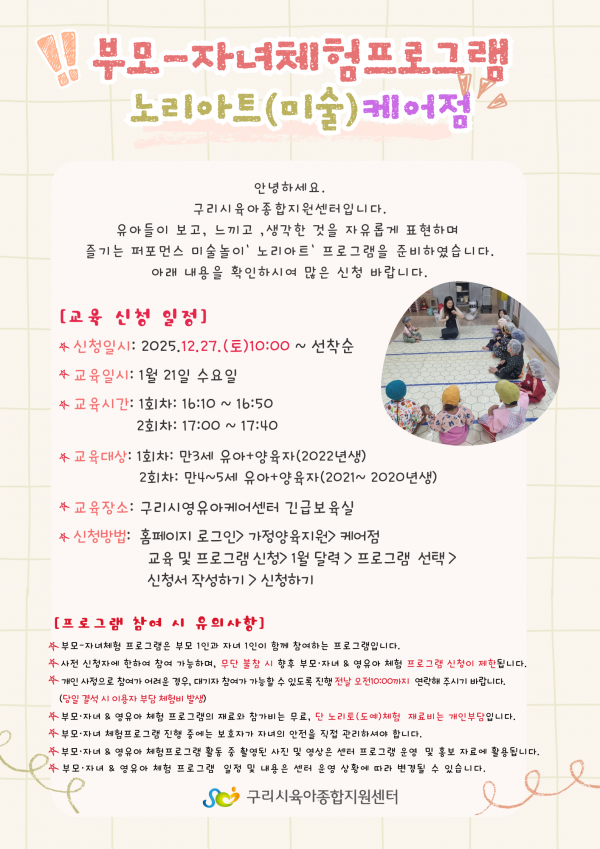 | 교육대상 | 구리시 관내 6세~7세 자녀와 양육자 | 교육정원 | 7명 (대기자 15명) |