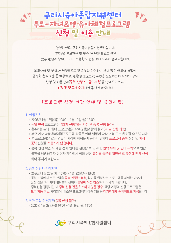 | 교육대상 | 구리시 관내 2023년생 자녀와 양육자 | 교육정원 | 10명 (대기자 5명) |