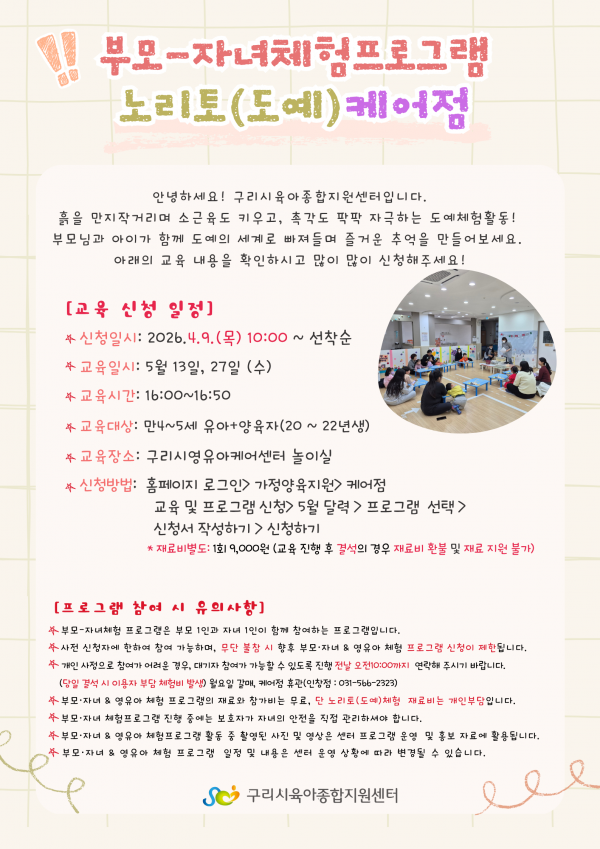 작성자 관리자 댓글 0건 조회 64회 작성일 2026-04-03 11:05| 구분 | 부모-자녀 프로그램 | 진행현황 | ![]() |