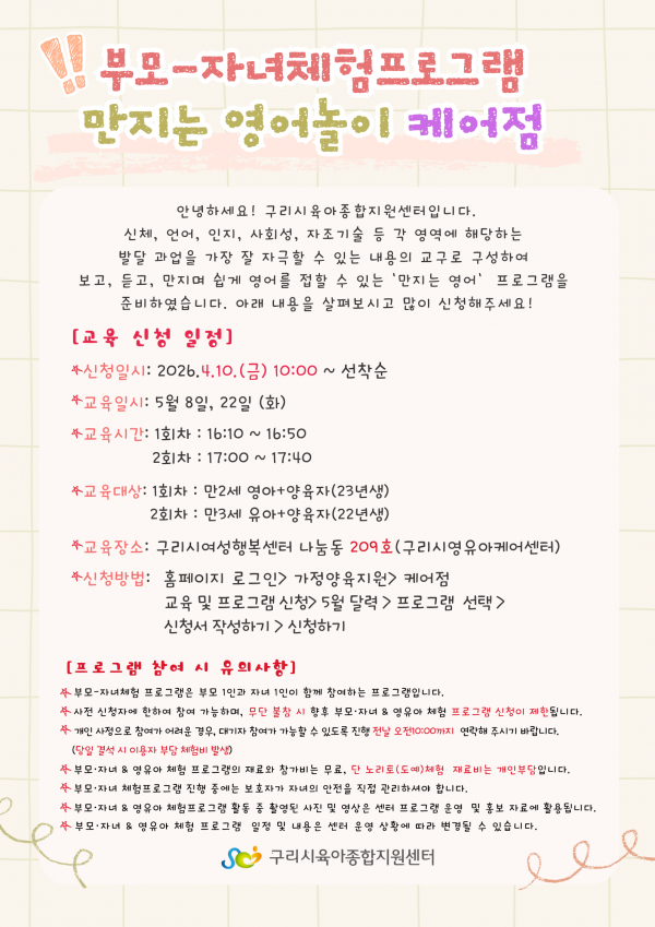 | 교육대상 | 만3세 유아+양육자 | 교육정원 | 10명 (대기자 10명) |