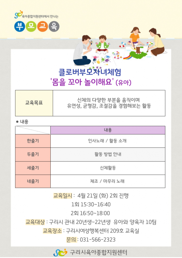 | 교육대상 | 구리시 관내 20년~22년생 유아와 양육자 | 교육정원 | 8명 (대기자 10명) |
