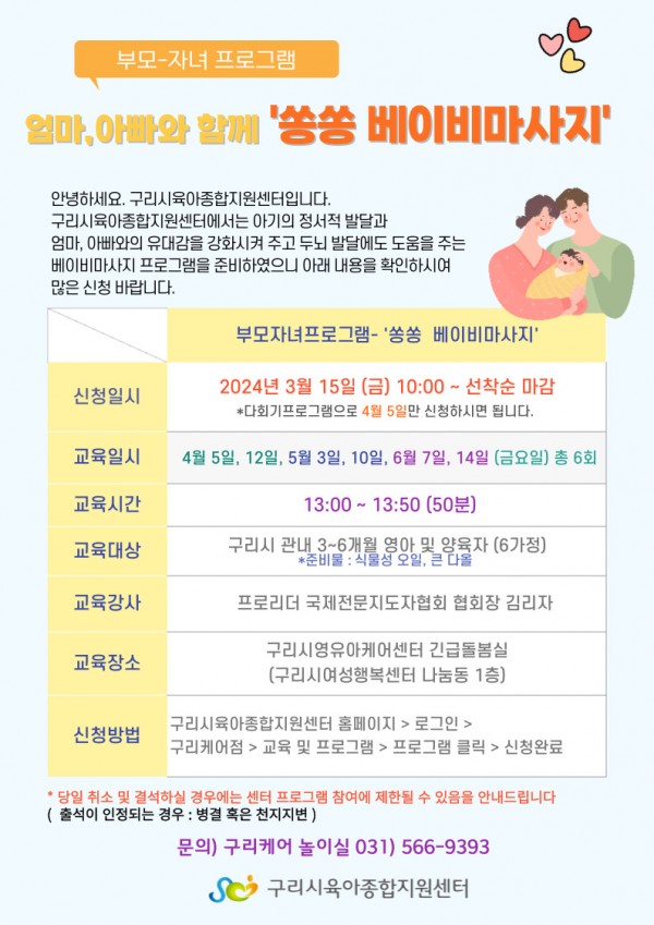 | 교육대상 | 구리시 관내 3개월~6개월 가정 | 교육정원 | 6명 (대기자 5명) |