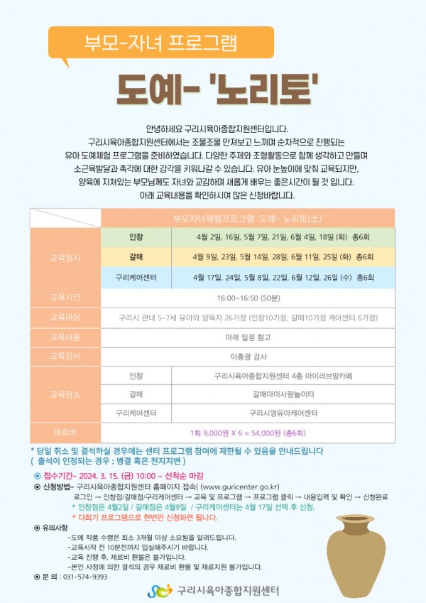 | 교육대상 | 구리시 관내 18~20년생 가정 | 교육정원 | 10명 (대기자 10명) |