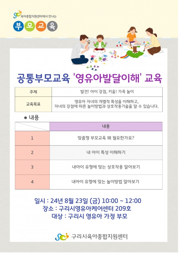 | 교육대상 | 구리시 관내 영유아 가정 부모 | 교육정원 | 15명 (대기자 5명) |
