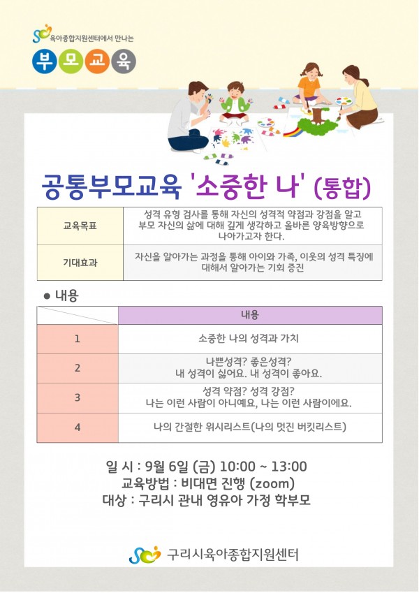 * 공통부모교육 이수하신 분은 4분기(10월~11월) 부모자녀체험프로그램 우선권 혜택이 있습니다.